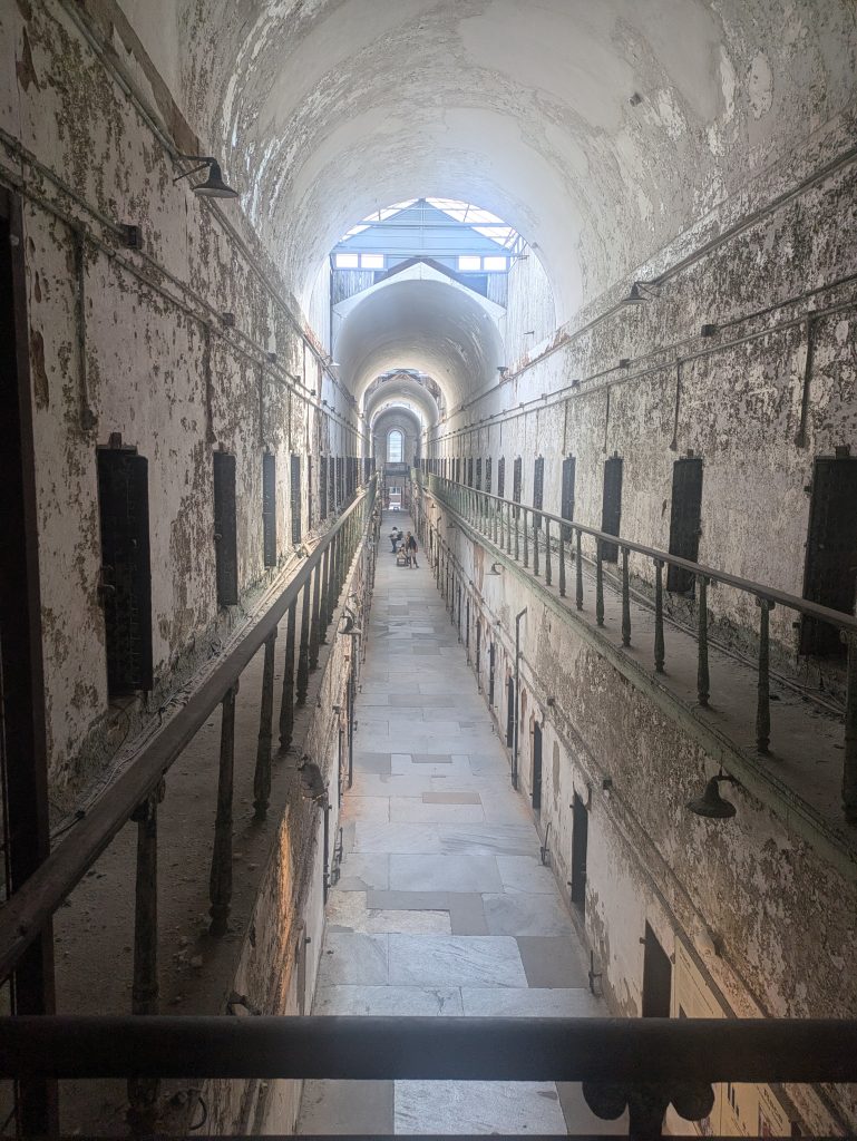 Then, we left and decided to get back on the bus to see a few more things and to give the kids a break from walking as they were extremely hot. We grabbed drinks from a vendor outside the bus stop before boarding. Our final stop of the day, ended up being at the Eastern State Penitentiary. The kids were much more fascinated with this tour than I expected. They enjoyed walking around with their headphone sets and following along and learning about the prison.